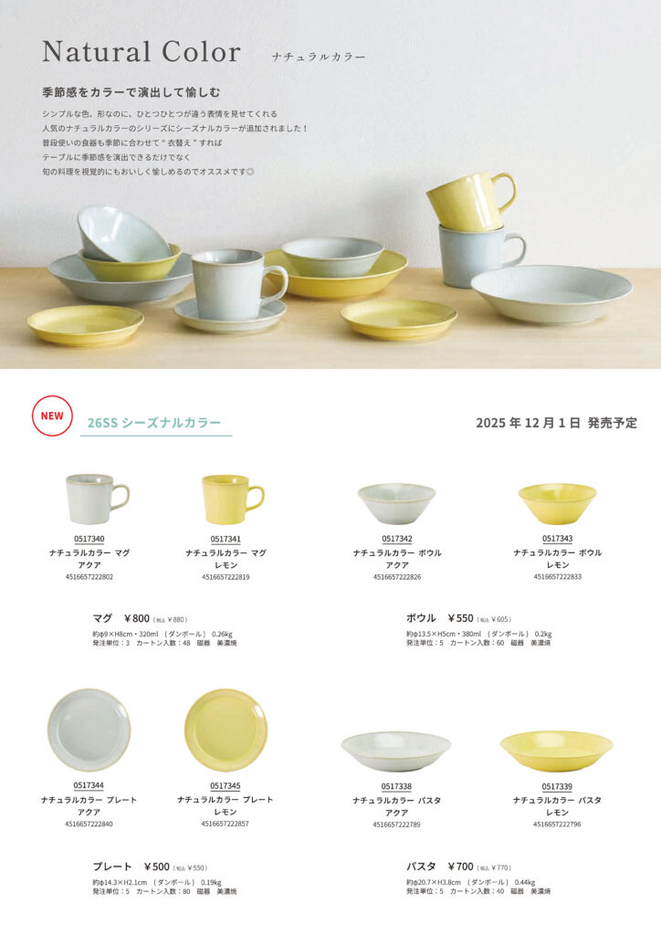 ナチュラルカラー2025AW・2026SS新色商品リストを発行しました。人気のナチュラルカラーのシリーズにシーズナルカラーが追加されました。普段使いの食器も季節に合わせて「衣替え」すればテーブルに季節感を演出できるだけでなく旬の料理を視覚的にもおいしく愉しめるのでオススメです◎